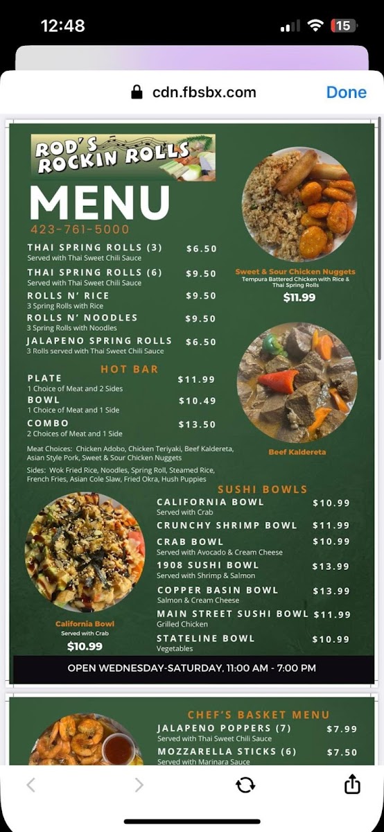 Welcome to Rod's Rockin Rolls, a culinary gem nestled at 327 Main St, Ducktown, TN. This vibrant eatery is known for its fresh, made-to-order meals, accentuated by a lively atmosphere. The menu is a delightful fusion of flavors, offering an enticing selection of appetizers including Thai Spring Rolls, Crab Rangoon, and Fried Mozzarella Cheese Sticks.
